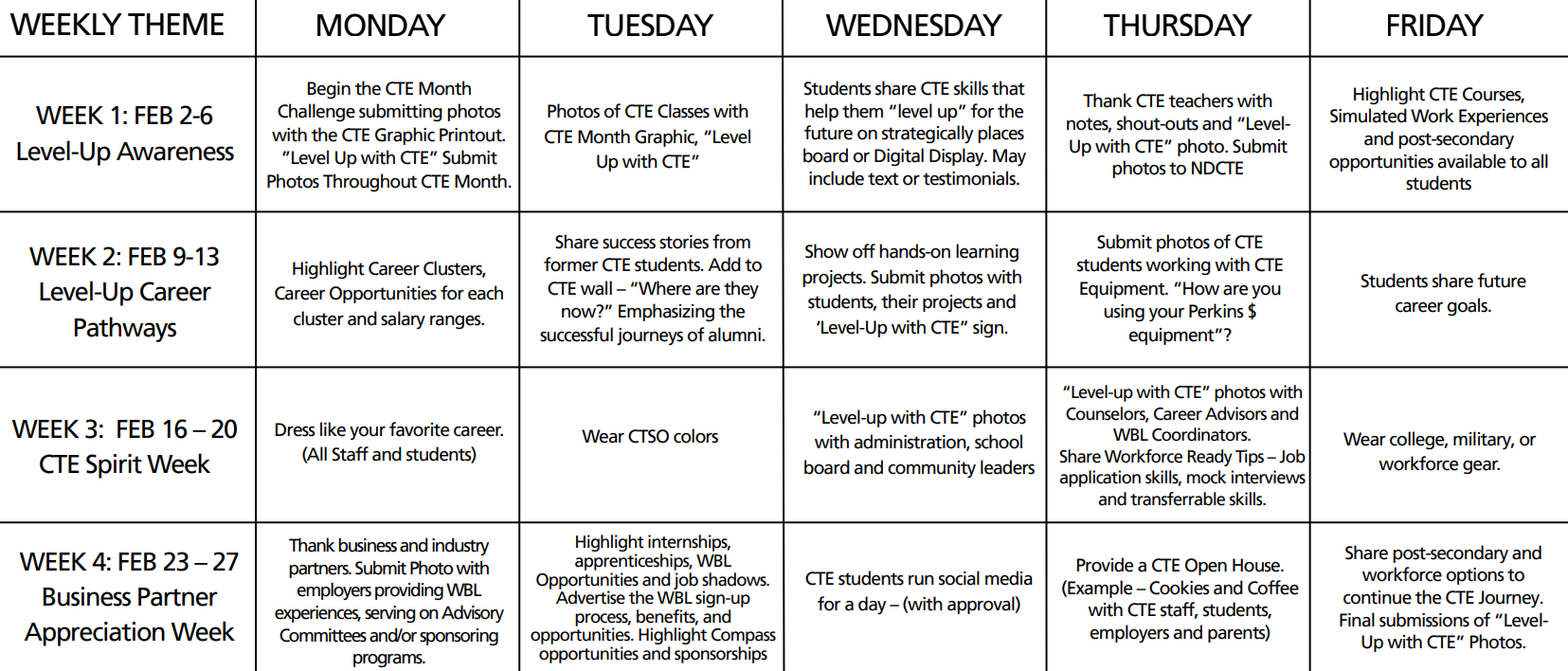 Game on! The CTE Month calendar is your guide to weekly themes and photo ideas that keep the excitement going. Get everyone involved!